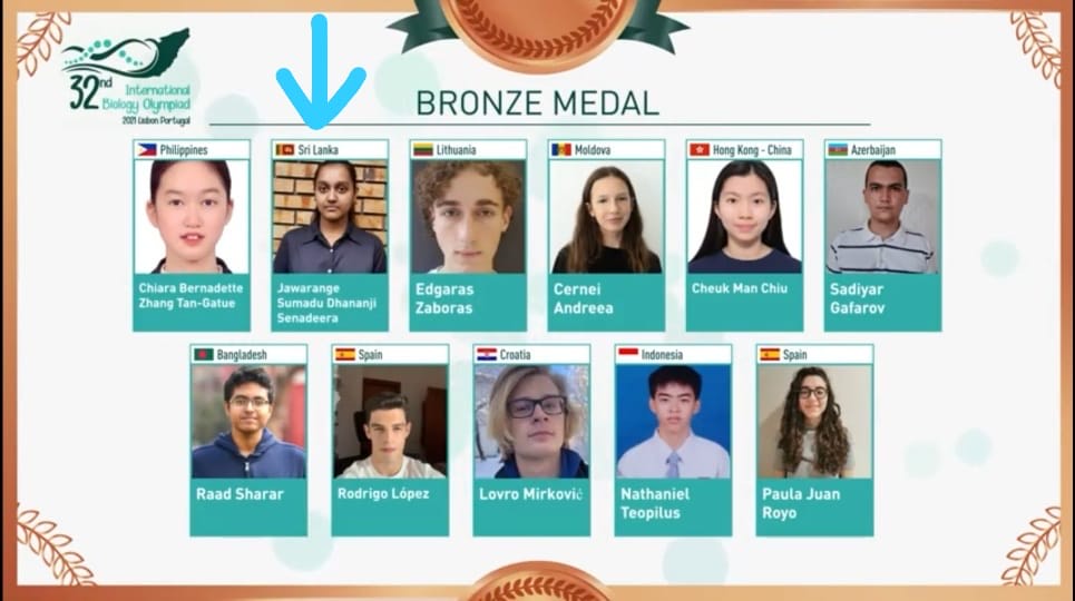Sumadu Senadeera of St. Joseph’s Balika college Kegalle won a Bronze Medal at International Biology Olympiad Competition for Sri Lanka. 32nd International Biology Olympiad 2021 was conducted from Lisbon Portugal from July 18-23. Due to COVID-19 global pandemic, this competition was held as an online examination. Theoretical and practical examinations of this competition was held at University of Sri Jayewardenepura on 19th and 21st July 2021.