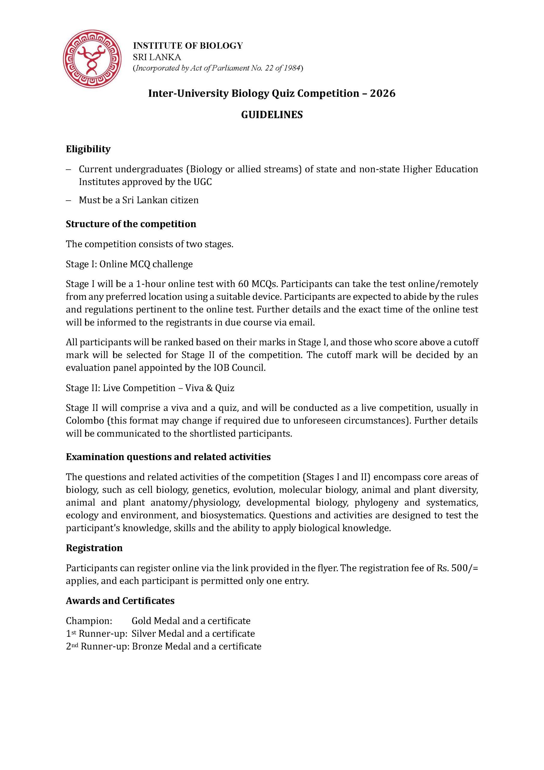 IOBSL is organizing the Inter-University Biology Quiz Competition for the undergraduates of State and UGC approved Universities in Sri Lanka for the 9th consecutive year in 2026. The competition aims at providing undergraduates with a novel educational experience and enhancing their interest in Biology. The competition will also provide an ideal opportunity for collaboration and inspiration among students, academics and universities across the country.